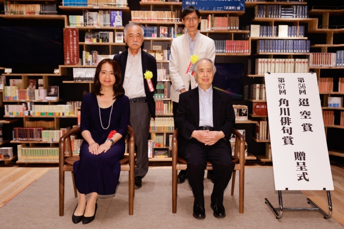 第67回角川俳句賞の岡田由季氏(前列左)と角川俳句賞選考委員の仁平勝氏と岸本尚毅氏、角川歴彦名誉会長(小澤實、正木ゆう子選考委員は欠席)